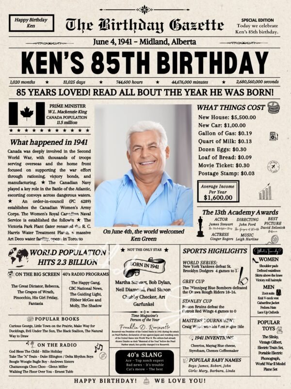 85th Birthday Newspaper Customized Canada