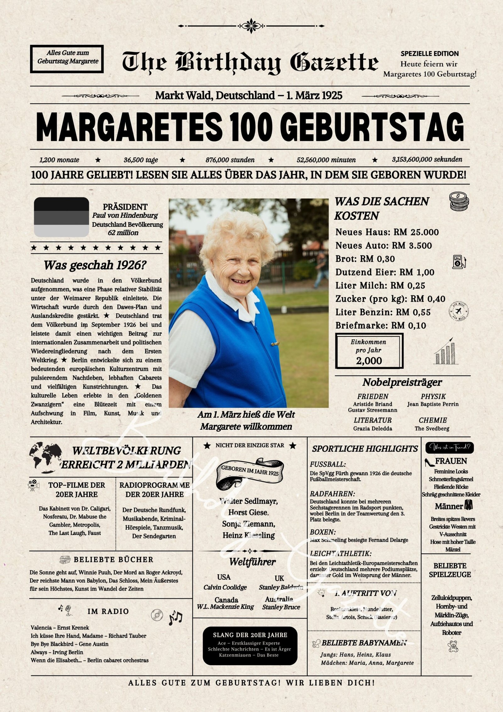 Looking for a meaningful 100th birthday gift in Germany? Celebrate this incredible milestone with our 100th birthday newspaper Germany. Personalized with their name, photo, birth date, and a special message, this newspaper includes fascinating historical facts from the year they were born, including notable events, popular entertainment, and more.