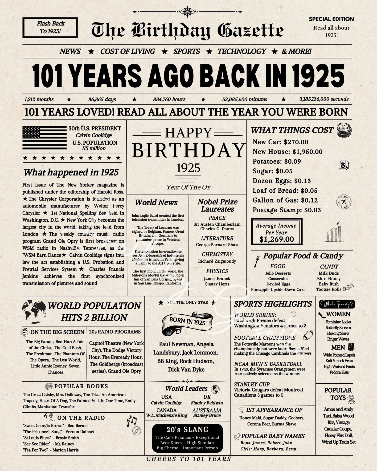 Looking for a 101st birthday gift for someone special? Celebrate their milestone with this 101st birthday newspaper download USA edition. Packed with fascinating facts and events from the year you were born, this newspaper-style print makes a unique and memorable gift. Available as an instant download, it’s a quick and easy birthday gift idea that can also double as a stunning 101st birthday sign for parties. With three sizes included, it’s perfect for framing or display. Whether you’re searching for a newspaper from the year you were born or a last-minute gift idea, this USA birthday newspaper is the perfect solution for creating a special celebration.