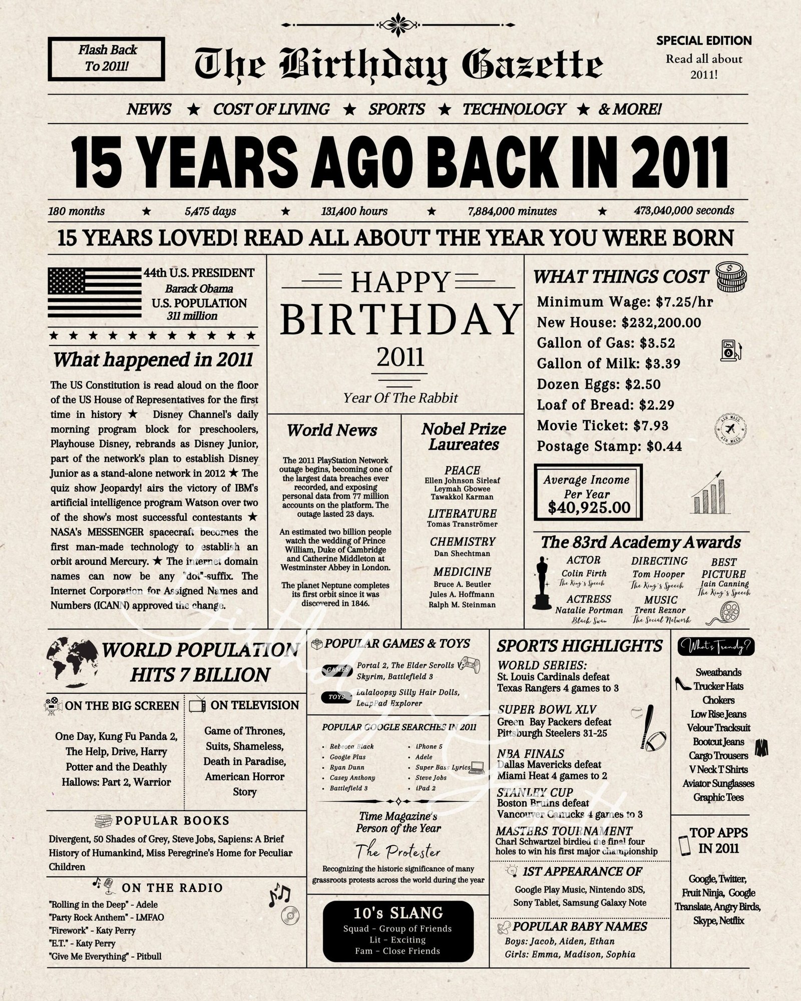 Looking for a 15th birthday gift for someone special? Celebrate their milestone with this 15th birthday newspaper download USA edition. Packed with fascinating facts and events from the year you were born, this newspaper-style print makes a unique and memorable gift. Available as an instant download, it’s a quick and easy birthday gift idea that can also double as a stunning 15th birthday sign for parties. With three sizes included, it’s perfect for framing or display. Whether you’re searching for a newspaper from the year you were born or a last-minute gift idea, this USA birthday newspaper is the perfect solution for creating a special celebration.