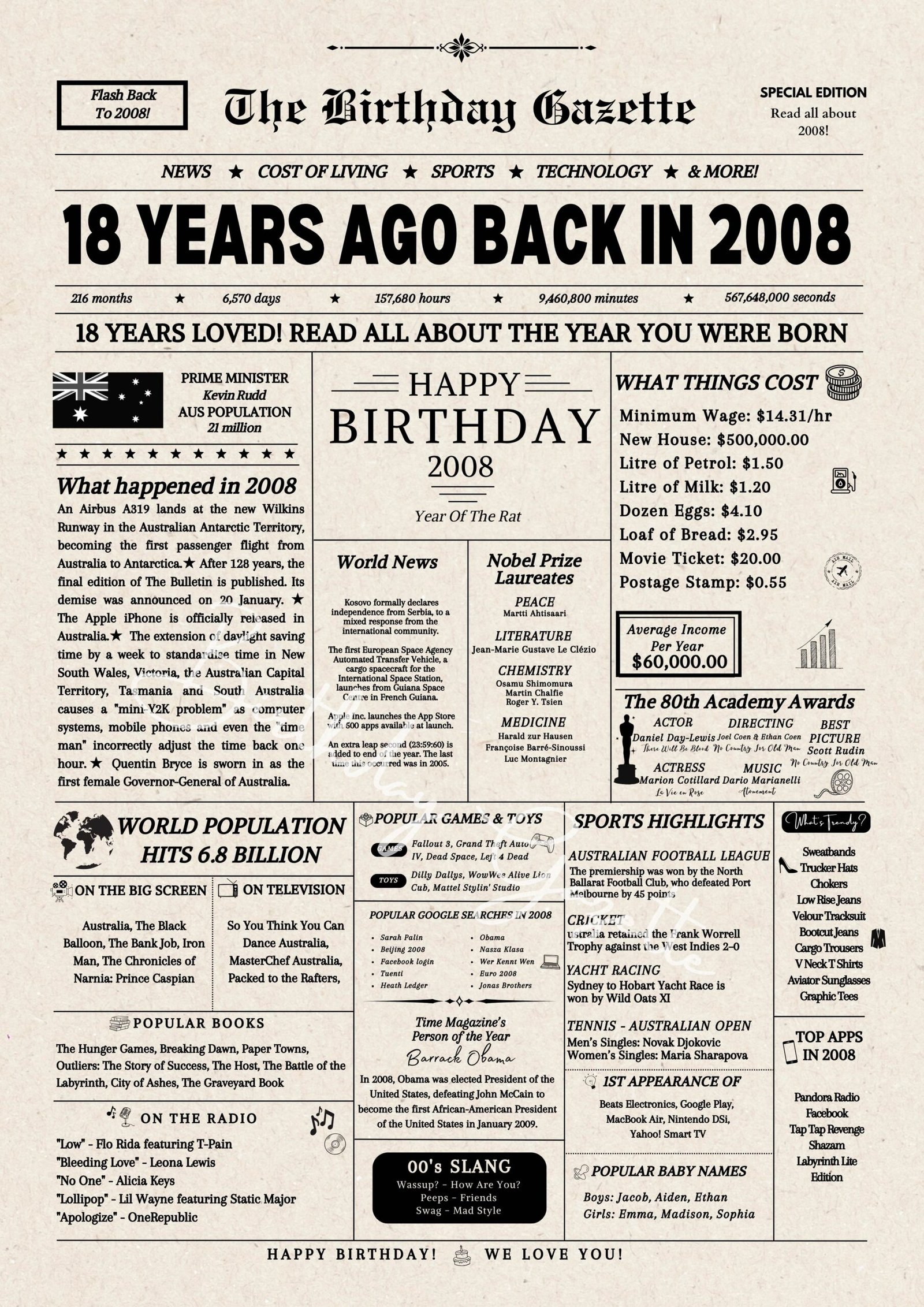 Looking for a 18th birthday gift for someone special? Celebrate their big day with this 18th birthday newspaper Australia edition. Featuring highlights and facts from the year you were born, this downloadable birthday gift is perfect as a 18th birthday sign or a unique gift idea. With three sizes to choose from, it’s easy to print and display, making it a thoughtful and convenient last-minute gift for any celebration.