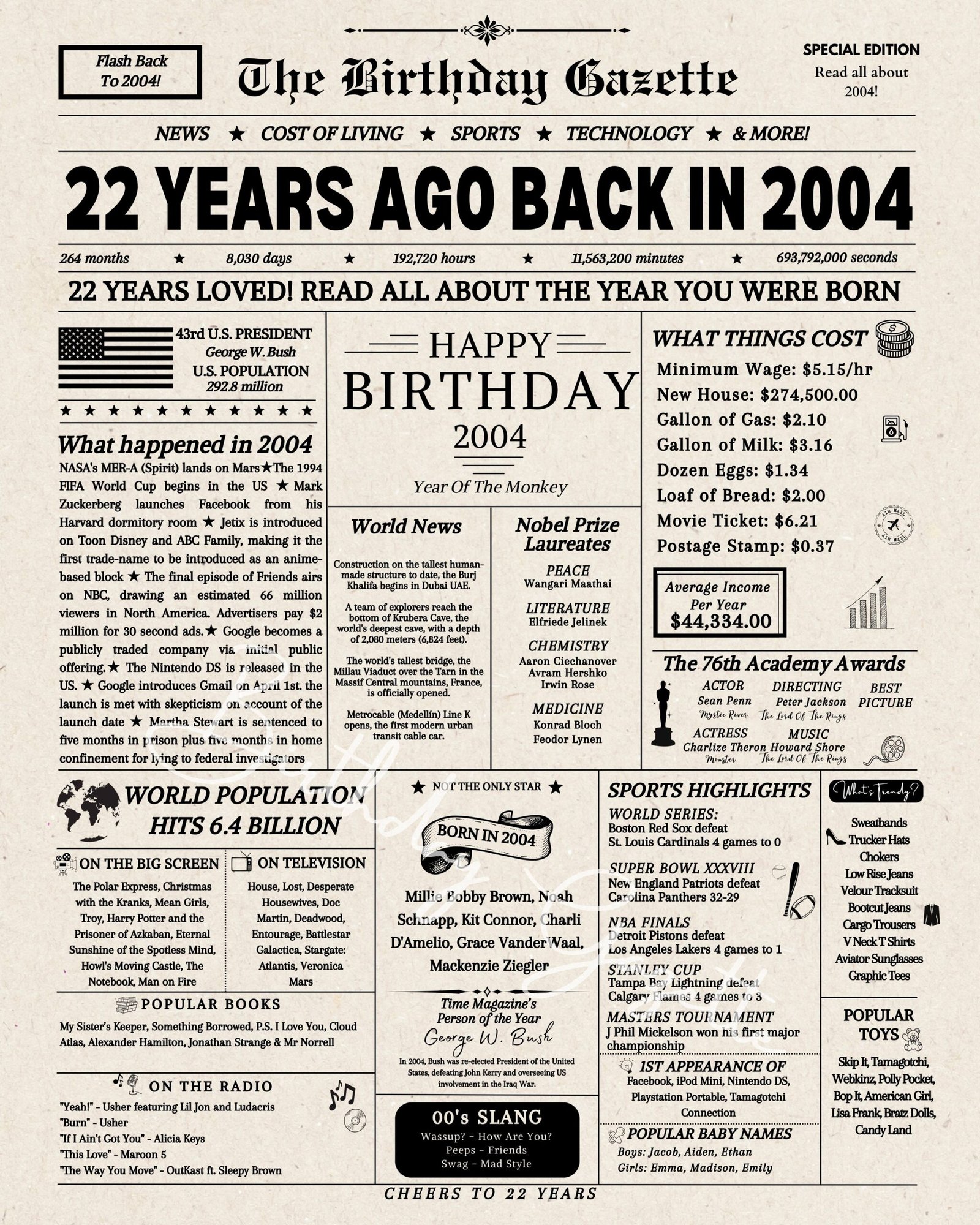 Looking for a unique and thoughtful 22nd birthday gift? Celebrate this milestone with a 22nd birthday newspaper download – USA edition. Filled with fascinating facts, headlines, and memorable moments from the year they were born, this newspaper-style print makes a meaningful and one-of-a-kind keepsake. Available as an instant download, it’s a quick and easy birthday gift idea that also works perfectly as a 22nd birthday sign for parties or celebrations. With three sizes included, it’s ideal for framing or display. Whether you’re searching for a newspaper from the year they were born or a last-minute gift idea, this USA birthday newspaper is a memorable way to mark their special day.
