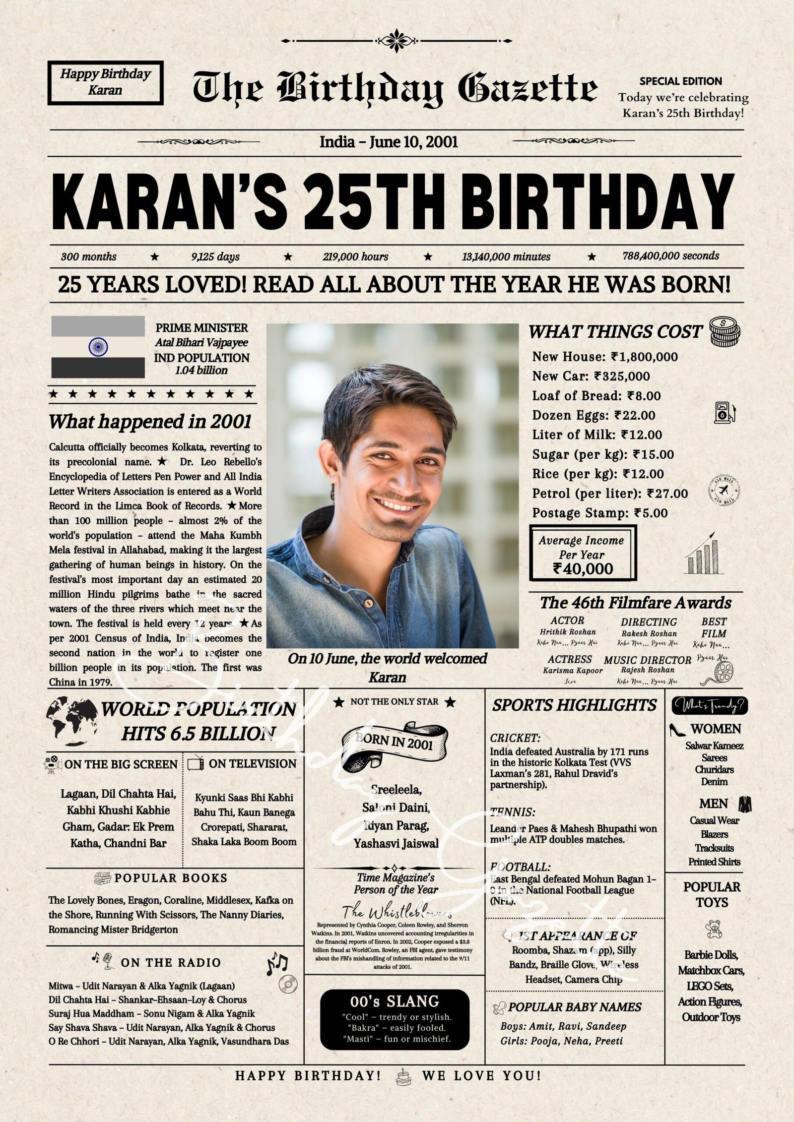 Looking for the perfect 25th birthday gift? Celebrate this milestone with a personalized India 25th birthday newspaper India! This special keepsake includes the recipient’s name, birth date, and a personalized message, along with fascinating facts, major events, and pop culture highlights from the year they were born. It’s a unique and thoughtful way to make their big day extra special.
