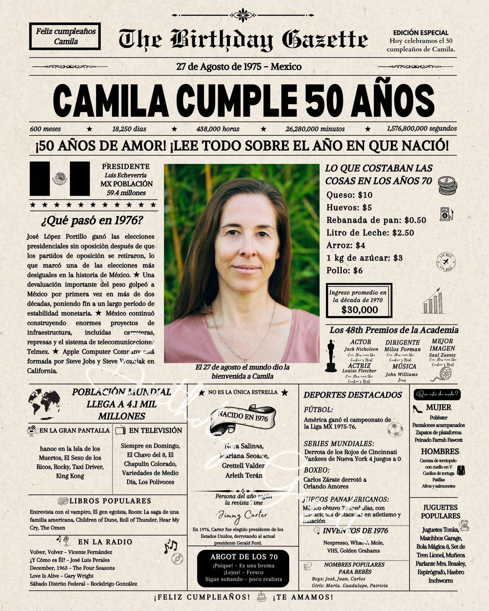 Looking for a thoughtful 50th birthday gift in Mexico? A personalized Mexico 50th birthday newspaper is a wonderful way to celebrate this milestone! Featuring their name, birth date, and a heartfelt message, this keepsake includes historical events, cultural moments, and fun facts from the year they were born.