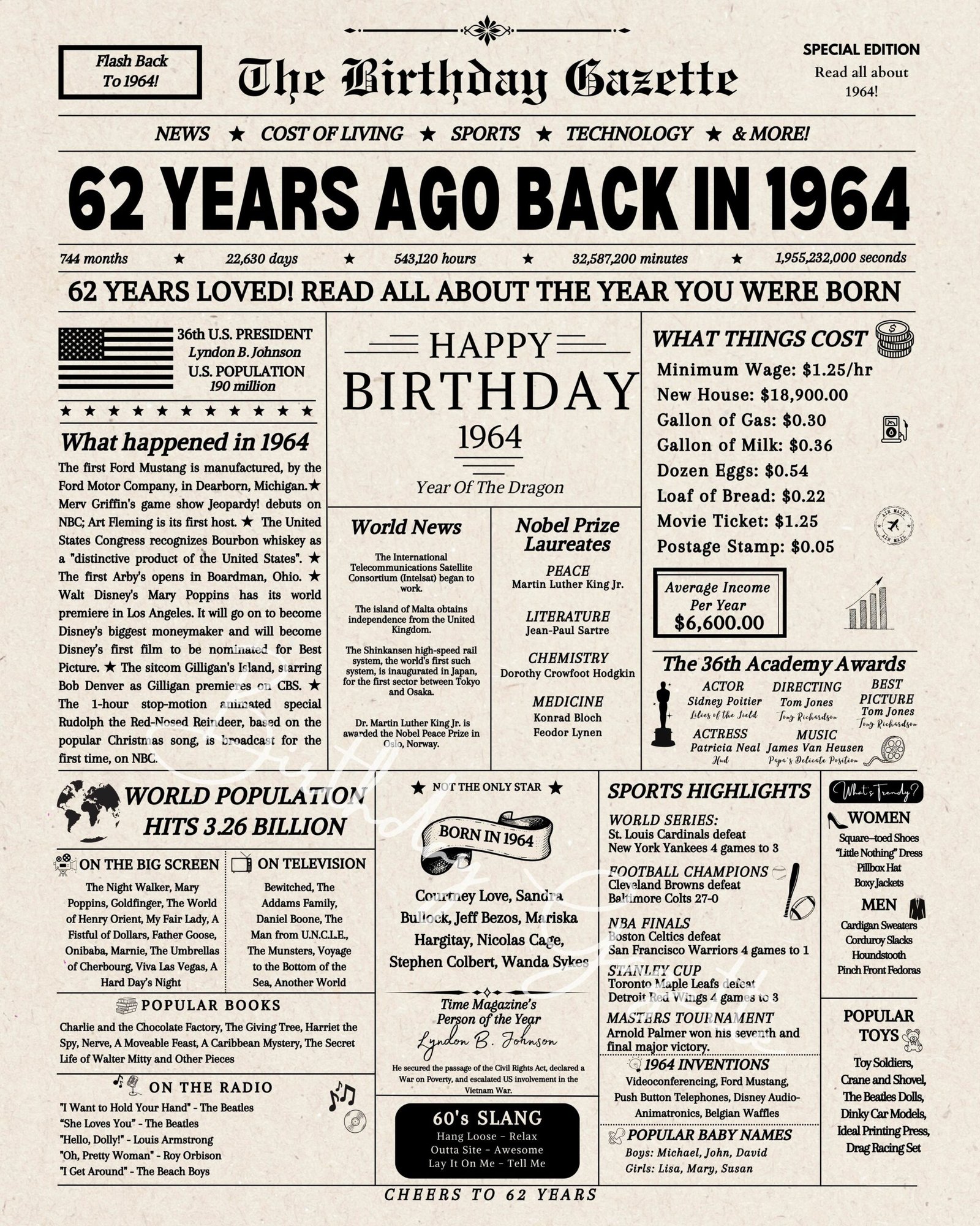 Looking for a meaningful 62nd birthday gift for someone special? Celebrate this milestone with a 62nd birthday newspaper download – USA edition. Filled with fascinating facts, headlines, and memorable moments from the year they were born, this newspaper-style print makes a truly unique and thoughtful keepsake. Available as an instant download, it’s a quick and easy birthday gift idea that also works beautifully as a 62nd birthday sign for parties or celebrations. With three sizes included, it’s perfect for framing or display. Whether you’re searching for a newspaper from the year they were born or a last-minute birthday gift, this USA birthday newspaper is a memorable way to mark their special day.