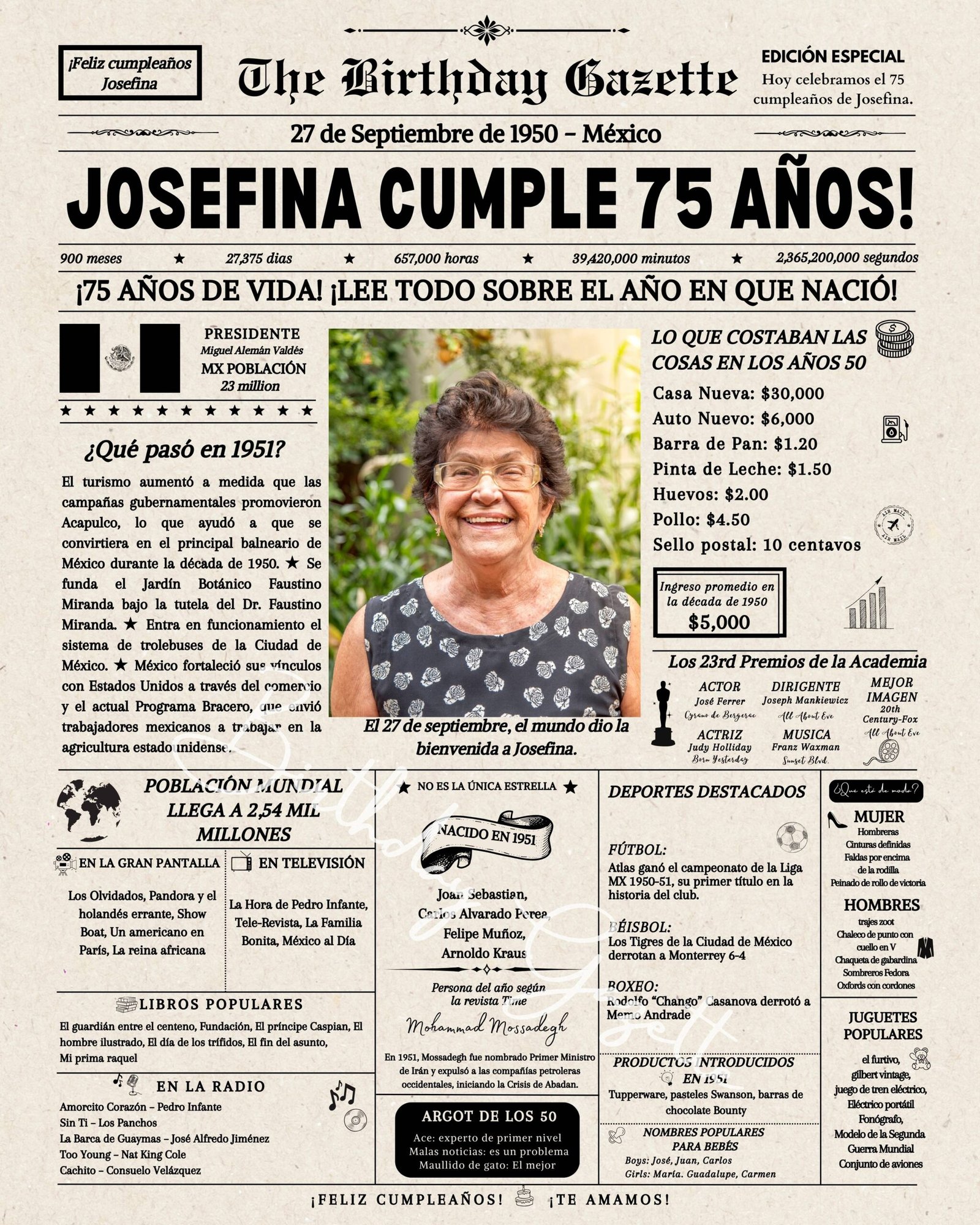 Perfect as a framed keepsake, party decoration, or addition to a birthday gift basket, these newspapers make unique birthday gifts. With our 24-48 hour turnaround, they’re also a great last-minute birthday gift for anyone celebrating their 75th in Mexico.