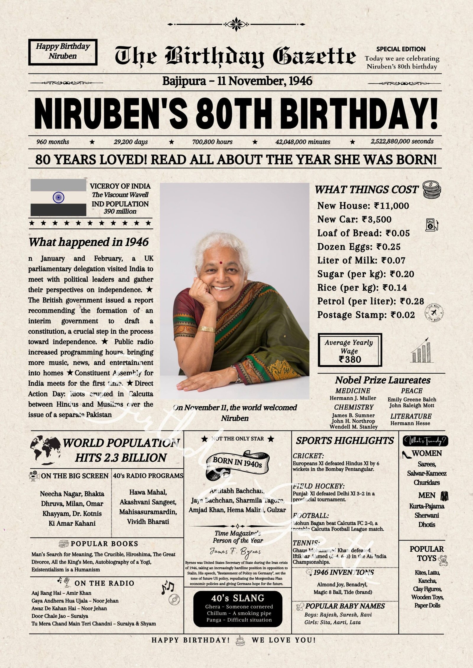 Looking for a meaningful 80th birthday gift in India? A personalized India 80th birthday newspaper is the perfect choice! Custom-made with their name, birth date, and a personal message, this keepsake highlights historical events and entertainment from the year they were born.